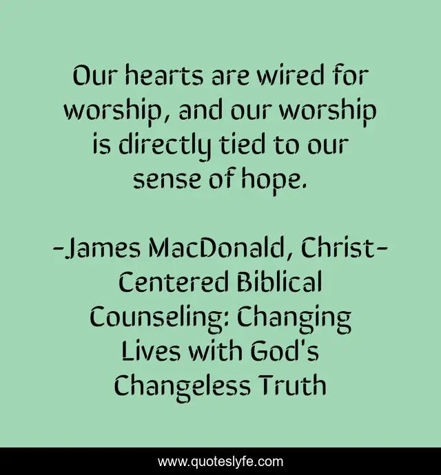 This page presents the quote "Our hearts are wired for worship, and our worship is directly tied to our sense of hope.". Author of this quote is James MacDonald, Christ-Centered Biblical Counseling: Changing Lives with God's Changeless Truth. This quote is about emotions, glory-of-god,.