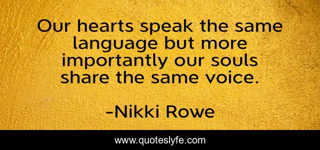 This page presents the quote "Our hearts speak the same language but more importantly our souls share the same voice.". Author of this quote is Nikki Rowe. This quote is about true-love, lovers, love, twinflame, twin-flame-love, connection, soul, synchronicity, depth,.