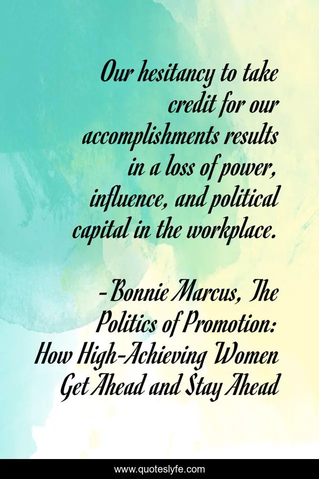 This page presents the quote "Our hesitancy to take credit for our accomplishments results in a loss of power, influence, and political capital in the workplace.". Author of this quote is Bonnie Marcus, The Politics of Promotion: How High-Achieving Women Get Ahead and Stay Ahead. This quote is about business, influence, accomplishments, workplace, politics, women,.
