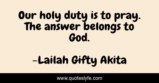 This page presents the quote "Our holy duty is to pray. The answer belongs to God.". Author of this quote is Lailah Gifty Akita. This quote is about pray, answered-to-prayer, christian, god, religion,.