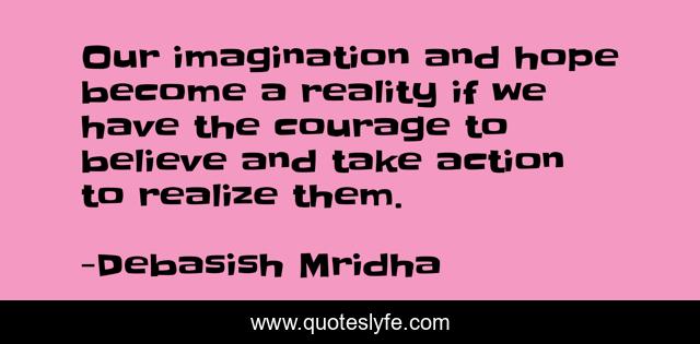 This page presents the quote "Our imagination and hope become a reality if we have the courage to believe and take action to realize them.". Author of this quote is Debasish Mridha. This quote is about imagination, philosophy, debasish-mridha, realize-your-dreams, quotes, courage-to-believe, debasish-mridha-md, inspirational, enthusiasm,.