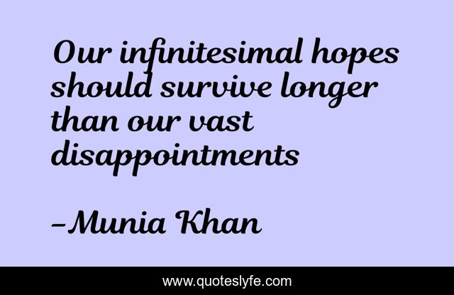 This page presents the quote "Our infinitesimal hopes should survive longer than our vast disappointments". Author of this quote is Munia Khan. This quote is about longer, hope, hopeful, disappointments, wisdom, infinitesimal, disappointment, hopeful-and-encouraging, hopes,.