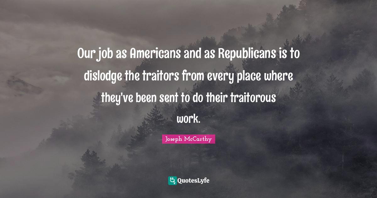 This page presents the quote "Our job as Americans and as Republicans is to dislodge the traitors from every place where they've been sent to do their traitorous work.". Author of this quote is Joseph McCarthy. This quote is about traitor, republican, work, jobs,.
