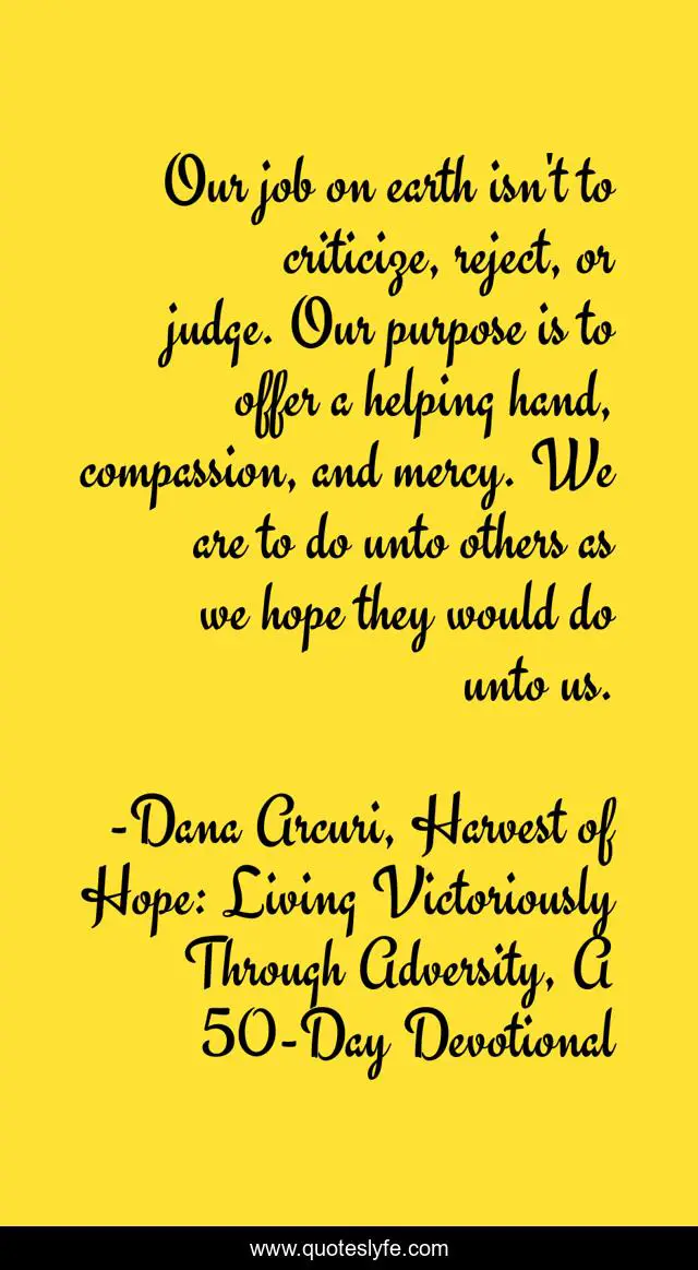 Our job on earth isn't to criticize, reject, or judge. Our purpose is to offer a helping hand, compassion, and mercy. We are to do unto others as we hope they would do unto us.