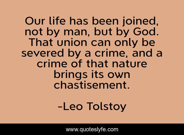 This page presents the quote "Our life has been joined, not by man, but by God. That union can only be severed by a crime, and a crime of that nature brings its own chastisement.". Author of this quote is Leo Tolstoy. This quote is about anna-karenina, marriage, adultery, god,.