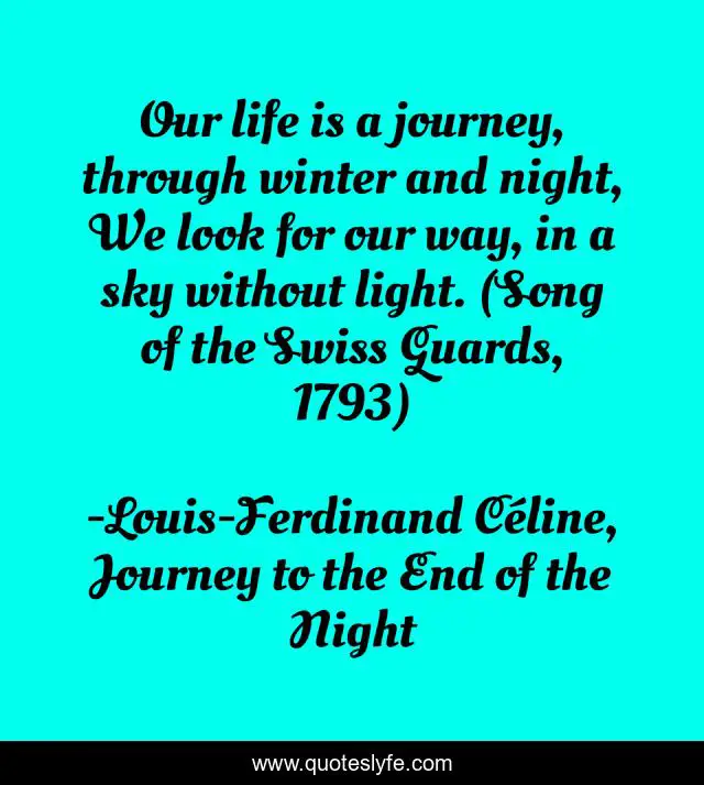 This page presents the quote "Our life is a journey, through winter and night, We look for our way, in a sky without light. (Song of the Swiss Guards, 1793)". Author of this quote is Louis-Ferdinand Céline, Journey to the End of the Night. This quote is about life, journey, winter-and-night,.