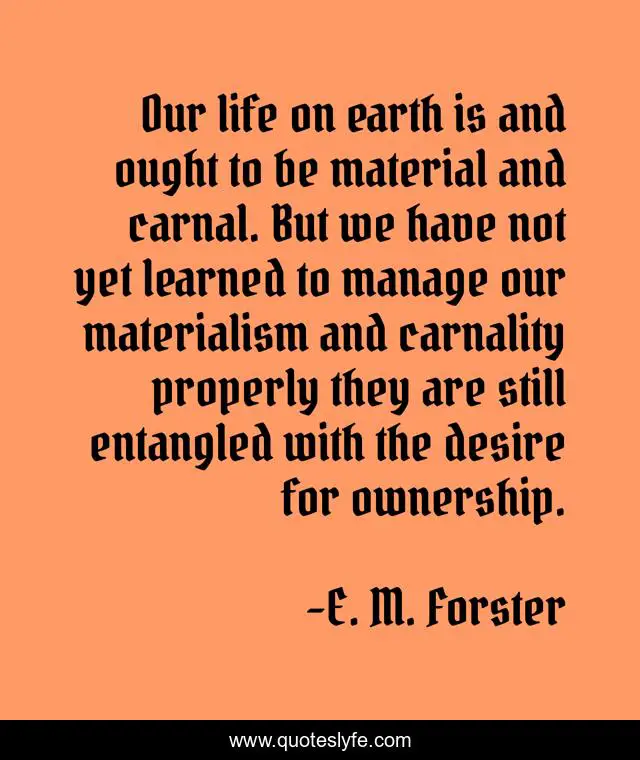 This page presents the quote "Our life on earth is and ought to be material and carnal. But we have not yet learned to manage our materialism and carnality properly they are still entangled with the desire for ownership.". Author of this quote is E. M. Forster. This quote is about possession, ownership,.