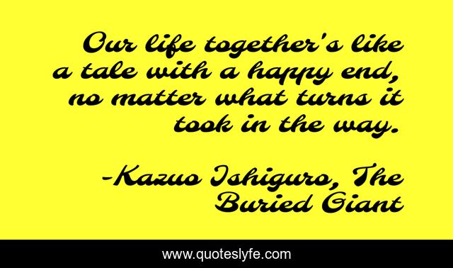 This page presents the quote "Our life together's like a tale with a happy end, no matter what turns it took in the way.". Author of this quote is Kazuo Ishiguro, The Buried Giant. This quote is about life, love, commitment, affection,.