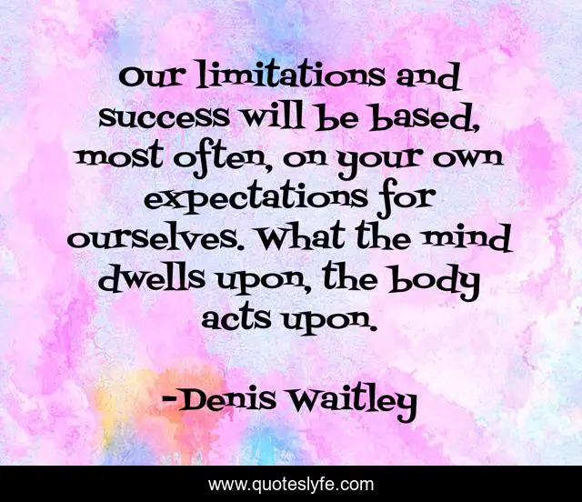 This page presents the quote "Our limitations and success will be based, most often, on your own expectations for ourselves. What the mind dwells upon, the body acts upon.". Author of this quote is Denis Waitley. This quote is about body, mind, expectations,.