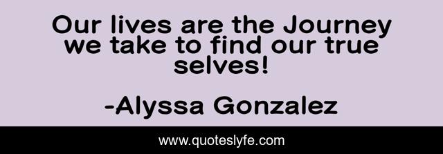 This page presents the quote "Our lives are the Journey we take to find our true selves!". Author of this quote is Alyssa Gonzalez. This quote is about strength, love, encouraging, inspirational, enthusiasm, affection,.