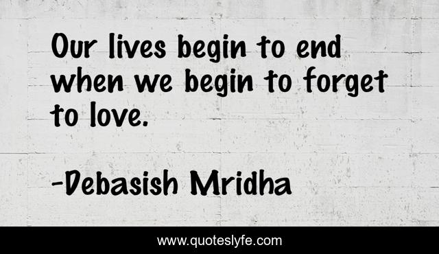 This page presents the quote "Our lives begin to end when we begin to forget to love.". Author of this quote is Debasish Mridha. This quote is about life, love, knowledge, inspirational, intelligence, philosophy, wisdom, quotes, affection,.