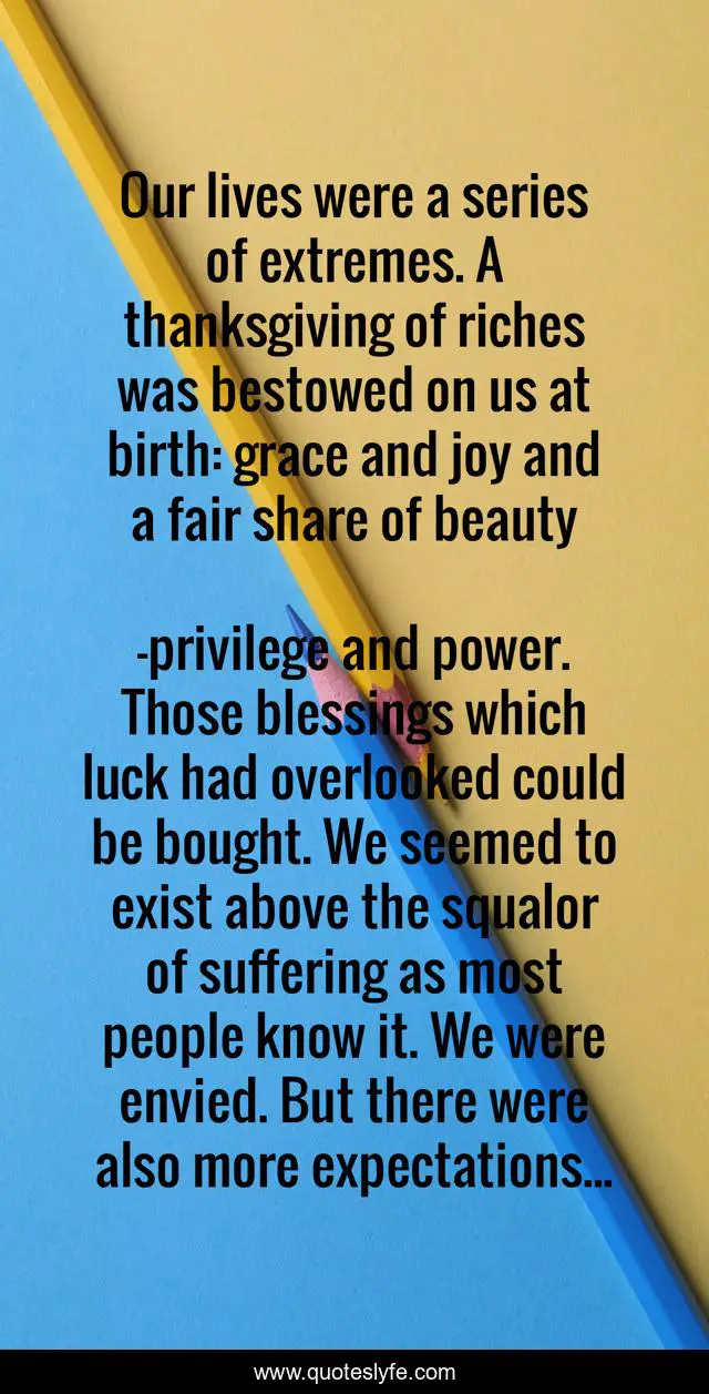 "privilege and power. Those blessings which luck had overlooked could be bought. We seemed to exist above the squalor of suffering as most people know it. We were envied. But there were also more expectations... Quotes." Quoteslyfe.com, 2025. Sat. 06 Dec. 2025. <https://www.quoteslyfe.com/quote/Our-lives-were-a-series-of-extremes-138397>.