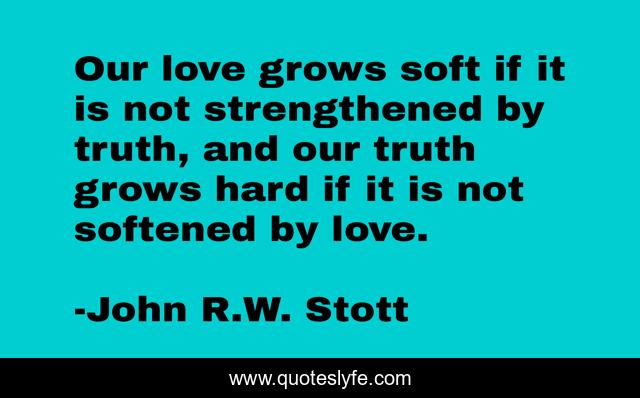 This page presents the quote "Our love grows soft if it is not strengthened by truth, and our truth grows hard if it is not softened by love.". Author of this quote is John R.W. Stott. This quote is about truth, god, love, grace, affection,.