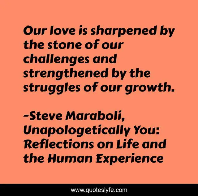This page presents the quote "Our love is sharpened by the stone of our challenges and strengthened by the struggles of our growth.". Author of this quote is Steve Maraboli, Unapologetically You: Reflections on Life and the Human Experience. This quote is about relationships, true-love, life, love, challenges, growth, happiness, affection,.