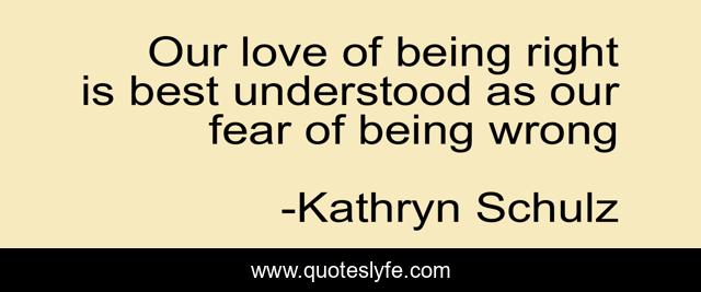 This page presents the quote "Our love of being right is best understood as our fear of being wrong". Author of this quote is Kathryn Schulz. This quote is about philisophical, being-wrong, psychology,.