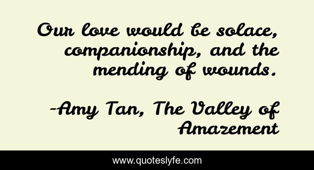 This page presents the quote "Our love would be solace, companionship, and the mending of wounds.". Author of this quote is Amy Tan, The Valley of Amazement. This quote is about inspirational, love, healing, affection, enthusiasm,.