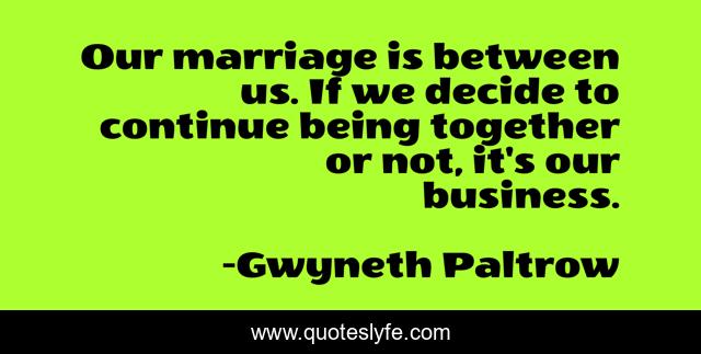 This page presents the quote "Our marriage is between us. If we decide to continue being together or not, it's our business.". Author of this quote is Gwyneth Paltrow. This quote is about marriage, together, between,.