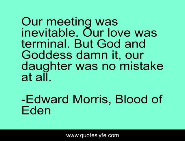 This page presents the quote "Our meeting was inevitable. Our love was terminal. But God and Goddess damn it, our daughter was no mistake at all.". Author of this quote is Edward Morris, Blood of Eden. This quote is about family, love, tragedy, affection,.
