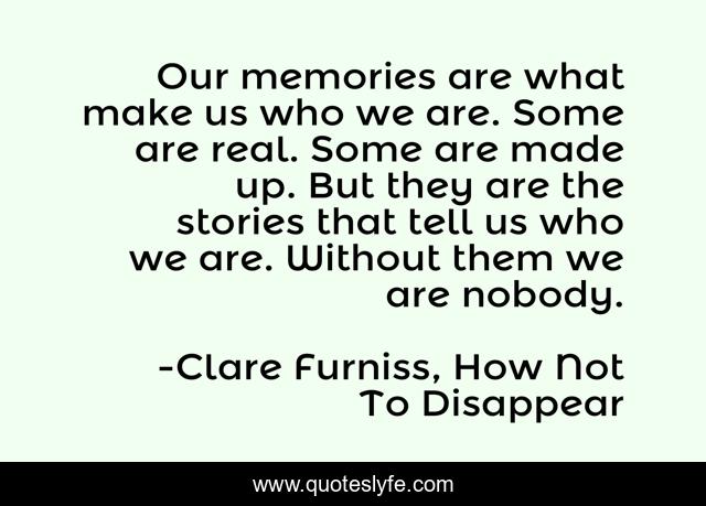 This page presents the quote "Our memories are what make us who we are. Some are real. Some are made up. But they are the stories that tell us who we are. Without them we are nobody.". Author of this quote is Clare Furniss, How Not To Disappear. .