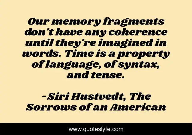 This page presents the quote "Our memory fragments don't have any coherence until they're imagined in words. Time is a property of language, of syntax, and tense.". Author of this quote is Siri Hustvedt, The Sorrows of an American. This quote is about imagination, language, words, memory,.