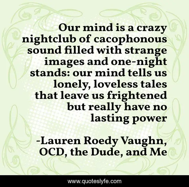 This page presents the quote "Our mind is a crazy nightclub of cacophonous sound filled with strange images and one-night stands: our mind tells us lonely, loveless tales that leave us frightened but really have no lasting power". Author of this quote is Lauren Roedy Vaughn, OCD, the Dude, and Me. This quote is about loneliness, worry,.