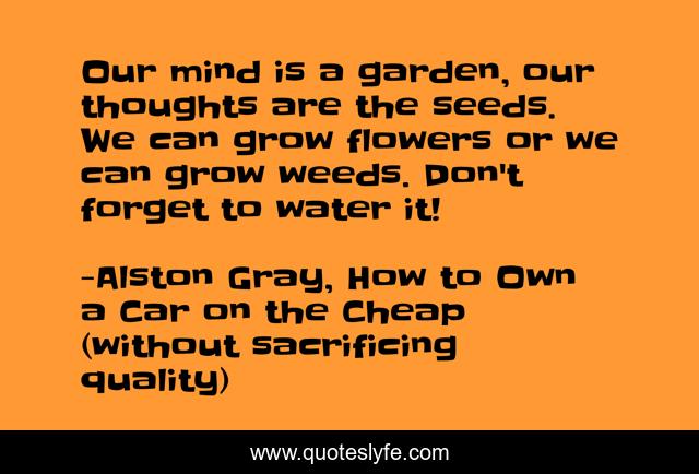 This page presents the quote "Our mind is a garden, our thoughts are the seeds. We can grow flowers or we can grow weeds. Don't forget to water it!". Author of this quote is Alston Gray, How to Own a Car on the Cheap (without sacrificing quality). This quote is about food-for-thought, positive, motivational, confidence, optimistic, inspirational, enthusiasm,.