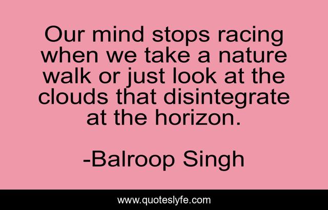 This page presents the quote "Our mind stops racing when we take a nature walk or just look at the clouds that disintegrate at the horizon.". Author of this quote is Balroop Singh. This quote is about mind-power, calmness, serenity, nature,.
