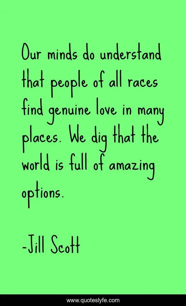 This page presents the quote "Our minds do understand that people of all races find genuine love in many places. We dig that the world is full of amazing options.". Author of this quote is Jill Scott. This quote is about world, love, affection, people,.