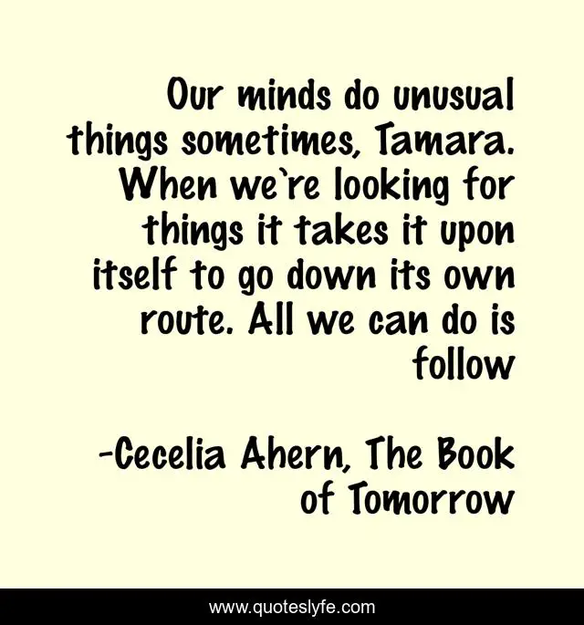 This page presents the quote "Our minds do unusual things sometimes, Tamara. When we’re looking for things it takes it upon itself to go down its own route. All we can do is follow". Author of this quote is Cecelia Ahern, The Book of Tomorrow. This quote is about enthusiasm, life-and-living, inspirational,.