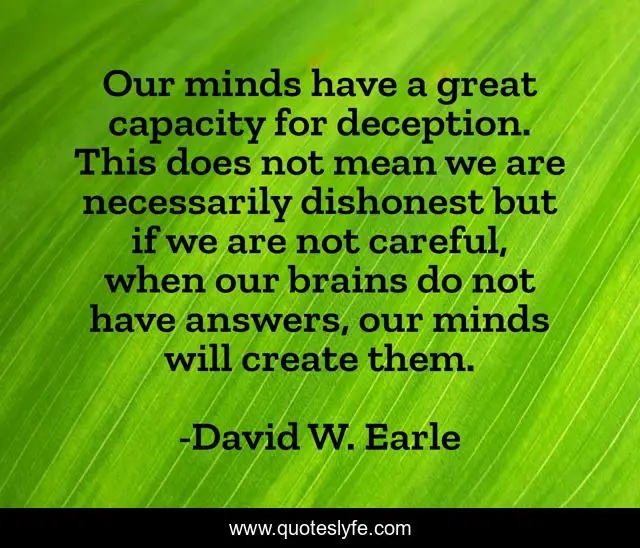 This page presents the quote "Our minds have a great capacity for deception. This does not mean we are necessarily dishonest but if we are not careful, when our brains do not have answers, our minds will create them.". Author of this quote is David W. Earle. This quote is about spirituality, deception, recovery, change, steps,.