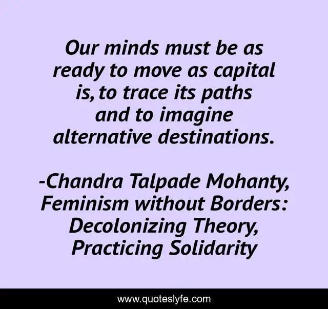 This page presents the quote "Our minds must be as ready to move as capital is, to trace its paths and to imagine alternative destinations.". Author of this quote is Chandra Talpade Mohanty, Feminism without Borders: Decolonizing Theory, Practicing Solidarity. This quote is about activism, social-justice, decolonization, solidarity, capitalism,.