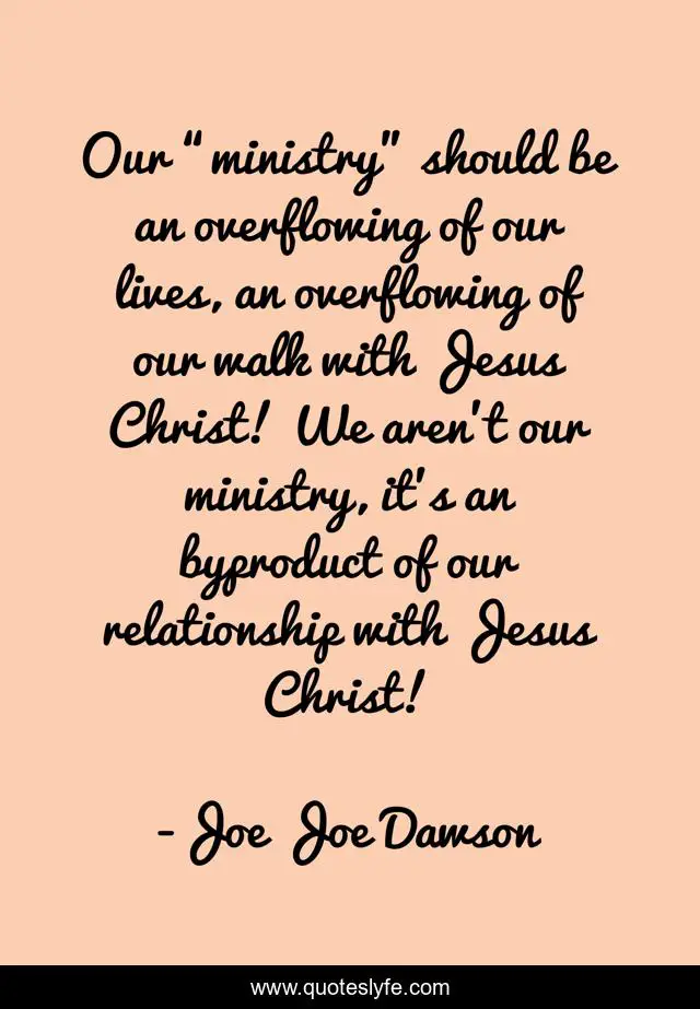 This page presents the quote "Our “ministry” should be an overflowing of our lives, an overflowing of our walk with Jesus Christ! We aren’t our ministry, it’s an byproduct of our relationship with Jesus Christ!". Author of this quote is Joe Joe Dawson. This quote is about jesus-christ, religion, church,.