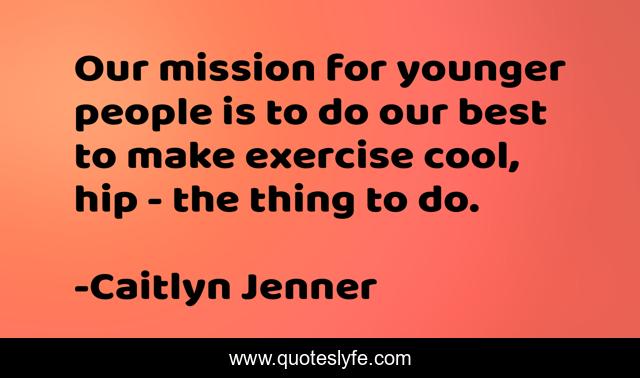 This page presents the quote "Our mission for younger people is to do our best to make exercise cool, hip - the thing to do.". Author of this quote is Caitlyn Jenner. This quote is about best, exercise, people,.
