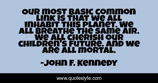 This page presents the quote "Our most basic common link is that we all inhabit this planet. We all breathe the same air. We all cherish our children's future. And we are all mortal.". Author of this quote is John F. Kennedy. This quote is about future, children, cherish,.
