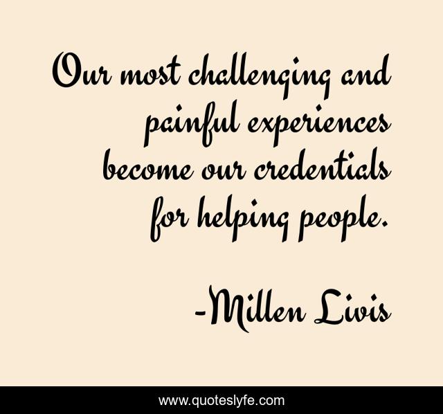 This page presents the quote "Our most challenging and painful experiences become our credentials for helping people.". Author of this quote is Millen Livis. This quote is about success, career, joy, profession, meaning, passion, purpose, happiness,.