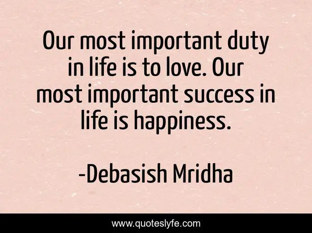 This page presents the quote "Our most important duty in life is to love. Our most important success in life is happiness.". Author of this quote is Debasish Mridha. This quote is about duty-in-life, love, life-lessons, success, philosophy, debasish-mridha, quotes, happiness, inspirational,.