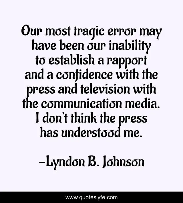 This page presents the quote "Our most tragic error may have been our inability to establish a rapport and a confidence with the press and television with the communication media. I don't think the press has understood me.". Author of this quote is Lyndon B. Johnson. This quote is about me, media, confidence,.