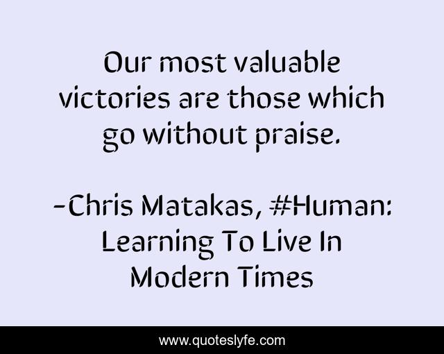 This page presents the quote "Our most valuable victories are those which go without praise.". Author of this quote is Chris Matakas, #Human: Learning To Live In Modern Times. This quote is about private-victory, praise,.