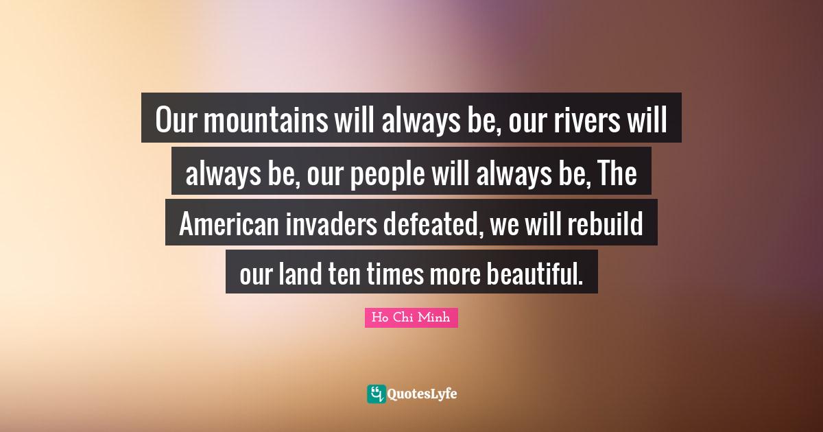 This page presents the quote "Our mountains will always be, our rivers will always be, our people will always be, The American invaders defeated, we will rebuild our land ten times more beautiful.". Author of this quote is Ho Chi Minh. This quote is about ten, rivers, defeated, perseverance, invaders, people, beautiful, land,.
