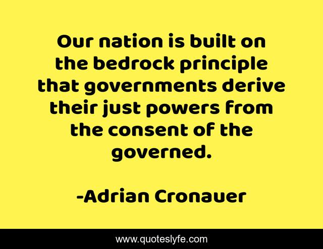This page presents the quote "Our nation is built on the bedrock principle that governments derive their just powers from the consent of the governed.". Author of this quote is Adrian Cronauer. This quote is about consent, just, nation,.