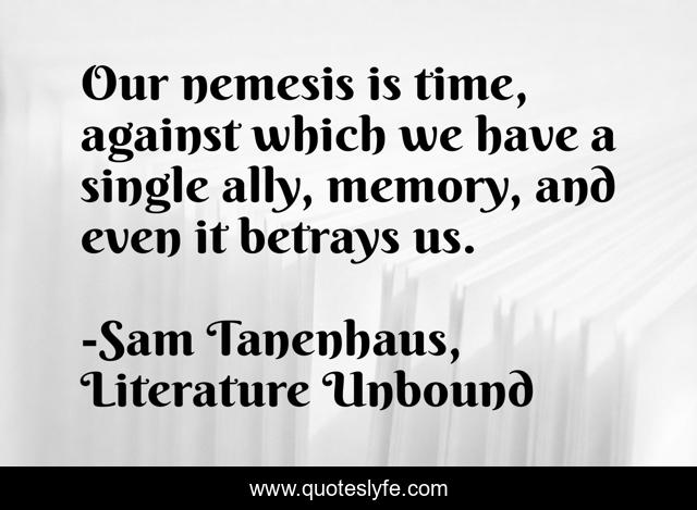 This page presents the quote "Our nemesis is time, against which we have a single ally, memory, and even it betrays us.". Author of this quote is Sam Tanenhaus, Literature Unbound. This quote is about memory, betrayal, time,.