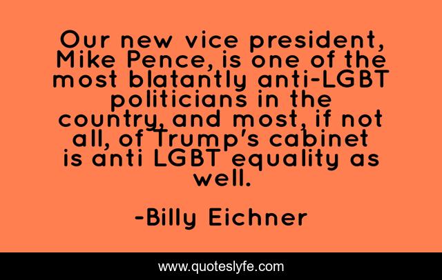 This page presents the quote "Our new vice president, Mike Pence, is one of the most blatantly anti-LGBT politicians in the country, and most, if not all, of Trump's cabinet is anti LGBT equality as well.". Author of this quote is Billy Eichner. This quote is about country, president, new,.