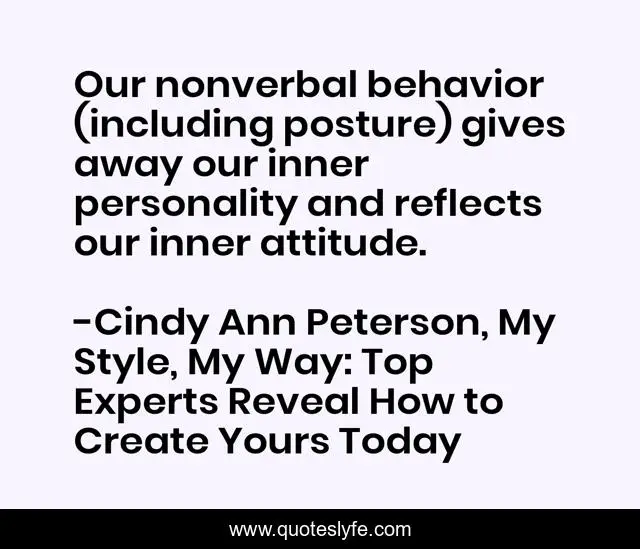 "Cindy Ann Peterson, My Style, My Way: Top Experts Reveal How to Create Yours Today Quotes." Quoteslyfe.com, 2025. Tue. 09 Dec. 2025. <https://www.quoteslyfe.com/quote/Our-nonverbal-behavior-including-posture-gives-away-144339>.