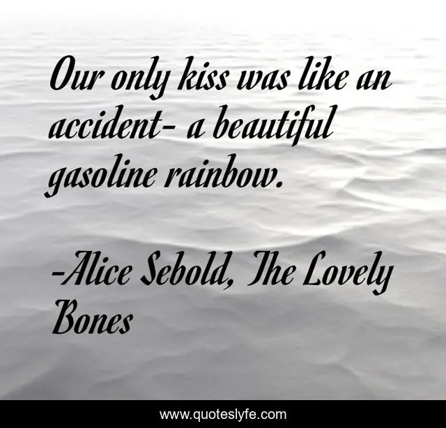 This page presents the quote "Our only kiss was like an accident- a beautiful gasoline rainbow.". Author of this quote is Alice Sebold, The Lovely Bones. This quote is about accident, gasoline-rainbow, kiss,.