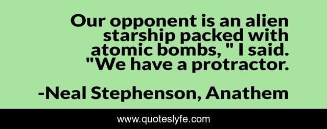 This page presents the quote "Our opponent is an alien starship packed with atomic bombs, " I said. "We have a protractor.". Author of this quote is Neal Stephenson, Anathem. .