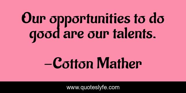This page presents the quote "Our opportunities to do good are our talents.". Author of this quote is Cotton Mather. .