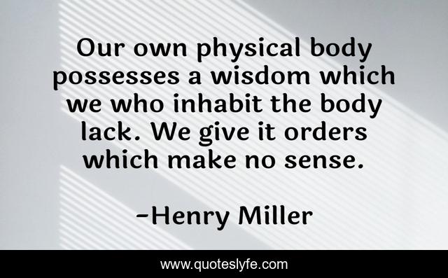 This page presents the quote "Our own physical body possesses a wisdom which we who inhabit the body lack. We give it orders which make no sense.". Author of this quote is Henry Miller. This quote is about body, sense, give,.