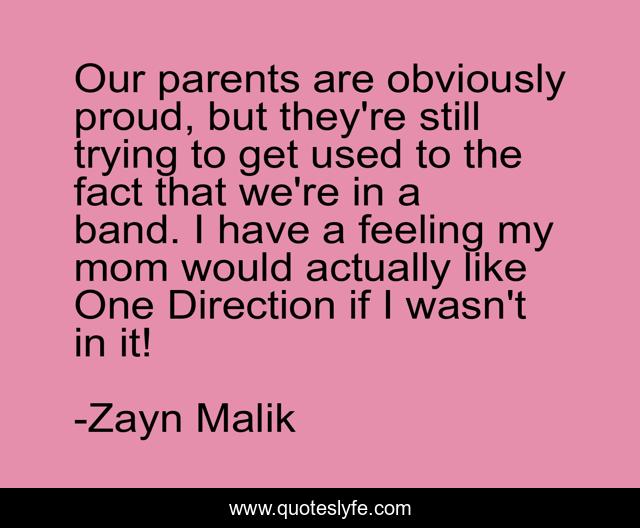 This page presents the quote "Our parents are obviously proud, but they're still trying to get used to the fact that we're in a band. I have a feeling my mom would actually like One Direction if I wasn't in it!". Author of this quote is Zayn Malik. This quote is about direction, proud, parents,.