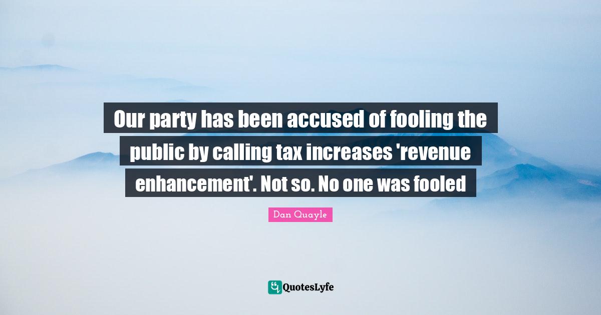 This page presents the quote "Our party has been accused of fooling the public by calling tax increases 'revenue enhancement'. Not so. No one was fooled". Author of this quote is Dan Quayle. This quote is about money, revenue, accused, party, enhancement, funny, fooled, calling,.