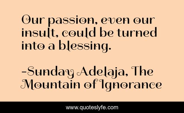 This page presents the quote "Our passion, even our insult, could be turned into a blessing.". Author of this quote is Sunday Adelaja, The Mountain of Ignorance. This quote is about mountain, life, darkness, power, danger, god, blessing, people, ignorance,.